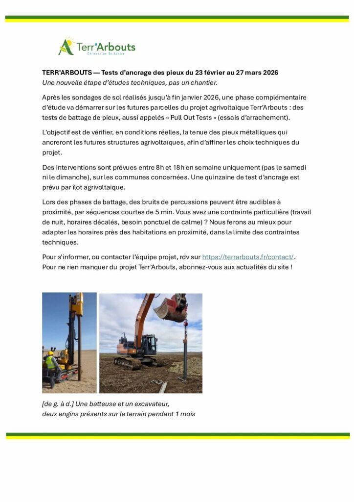 TERR’ARBOUTS : TESTS D’ANCRAGE DE PIEUX 23 FEV. AU 27 MARS 2026